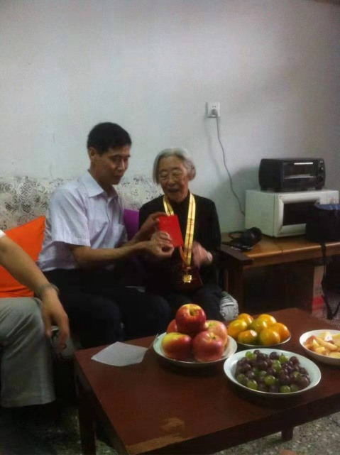 图示:邵景老人在抗战胜利70周年之际,在家中接受了“抗战胜利勋章。”